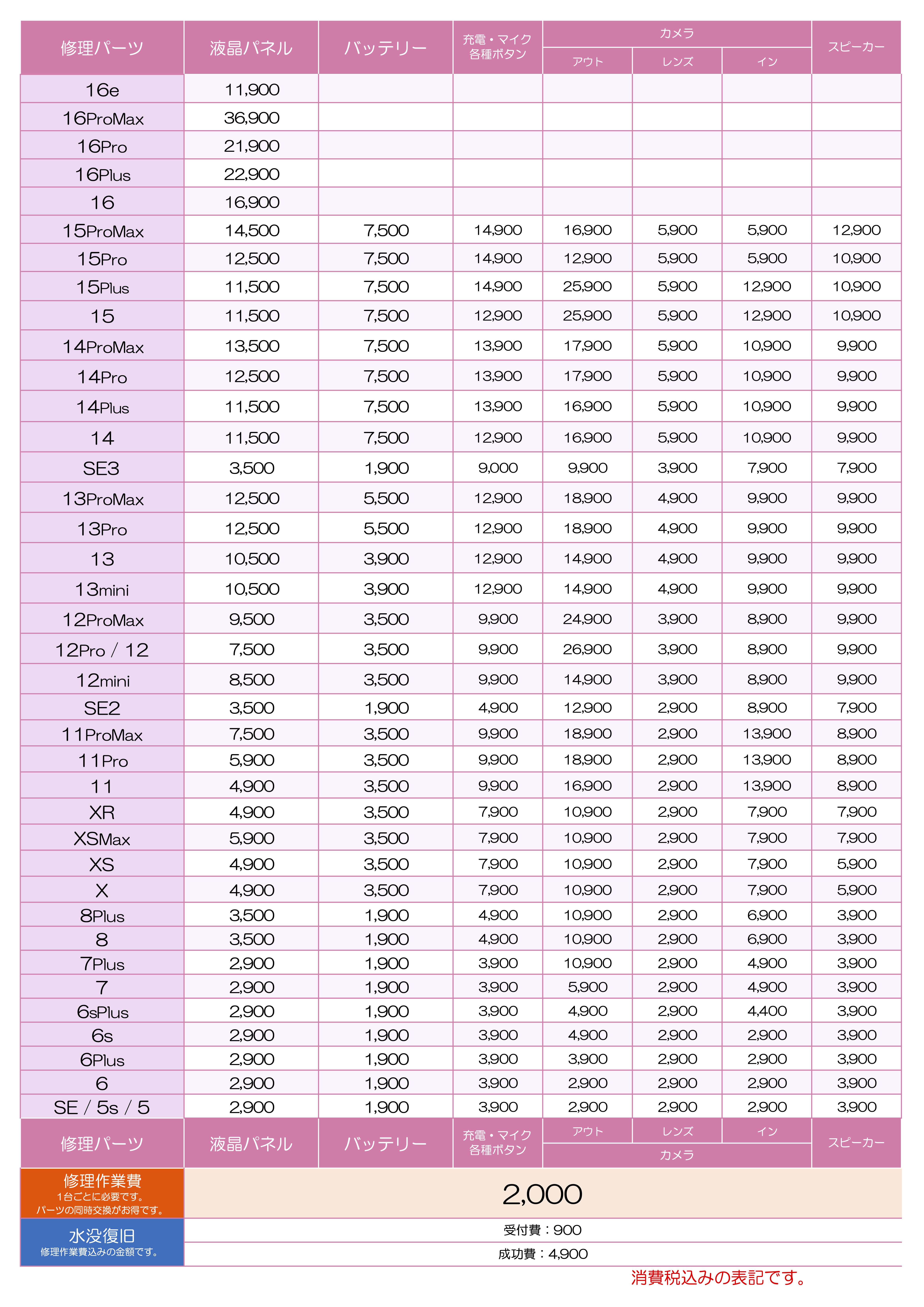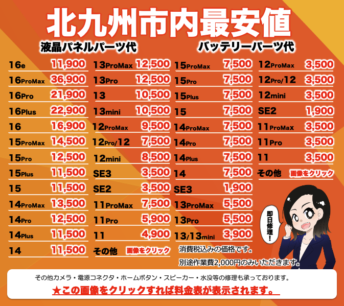 iPhone16/16plus/16Pro/16ProMax/16e iPhone15/15plus/15Pro/15ProMax iPhone14/14plus/14Pro/14ProMax iPhone13/13mini/14Pro/14ProMax iPhone12/12mini/12Pro/12ProMax iPhoneSE/SE2/SE3 iPhone11/11Pro/11ProMax iPhoneXS/XsMax/XR iPhoneX iPhone8/8Plus iPhone7/7Plus iPhone6s/6sPlus iPhone6/6Plus iPhone5/5s/5c/SE(第1世代) iPhone4s(事前予約が必要です。) iPad 1st/2nd/3rd/4th/5th/6th/7th/8th/9th iPad Air/Air2/Air3/Air4 iPad mini/mini2//mini3//mini4/mini5/mini6 iPad Pro 9.7/Pro 10.5/Pro 11/Pro 2nd/Pro 3rd/Pro 12.9 1st/Pro 12.9 2nd/Pro 12.9 3rd/Pro 12.9 4th/Pro 12.9 5th ガラスパネル/液晶パネル/水没復旧/データ復旧/バッテリー/ホームボタン/カメラ/充電ケーブル/スピーカー等